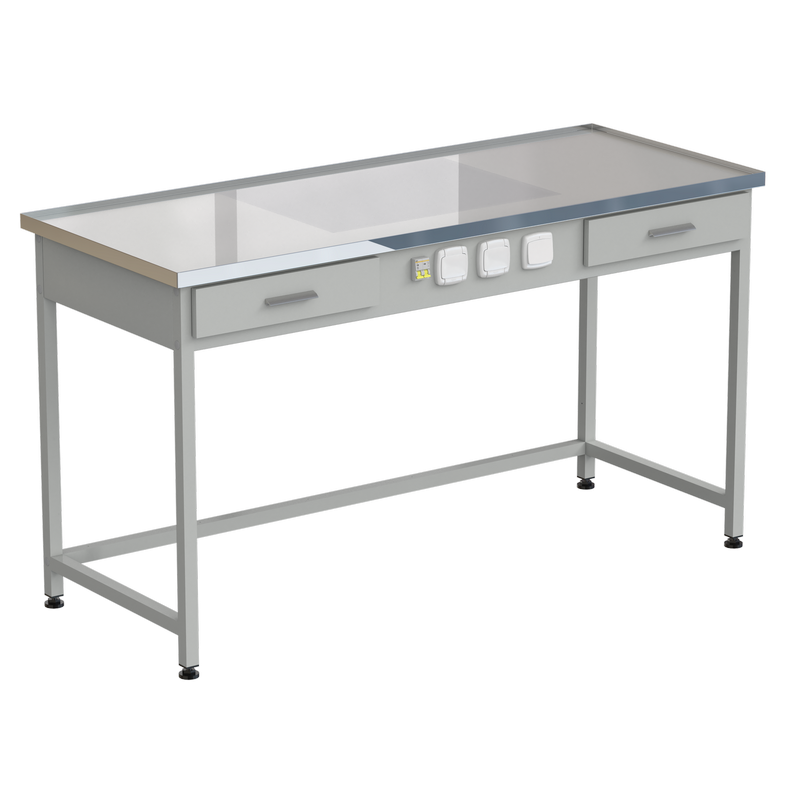 Вся поверхность столешницы накрыта 5 мм закаленным стеклом. Металлический каркас оснащен двумя выдвижными ящиками и панелью с двумя розетками на 220В, выключателем подсветки, автоматическим выключателем с током срабатывания 10А.