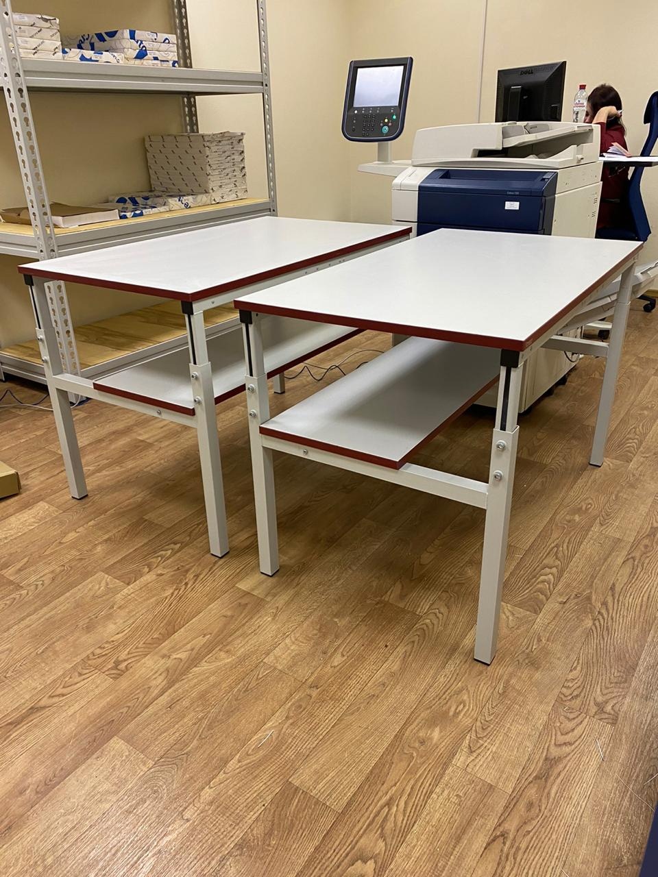 Столешница промышленного стола СПБ изготовлена из ламинированного ДСП толщиной 25 мм. Износостойкое покрытие из промышленного пластика обладает высокой стойкостью к термическим и механическим нагрузкам. Цвет кромки стола — бордовый, соответствует фирменному стилю компании.
