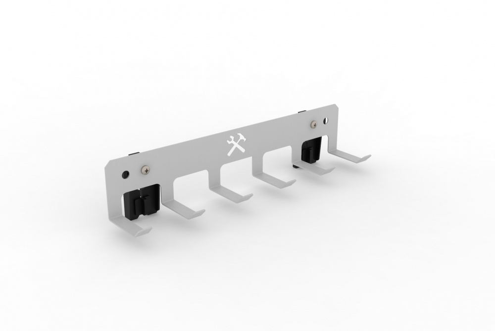 Металлический держатель с 6 крючками производства ДВК. Отлично подойдет к нашей металлической мебели. Ознакомьтесь с ней на странице нашего магазина, там же Вы найдете другие навески и держатели. Держатель крепится к перфорированной панели. Надежность крепления обеспечивается пластмассовым фиксатором с поворотным механизмом.