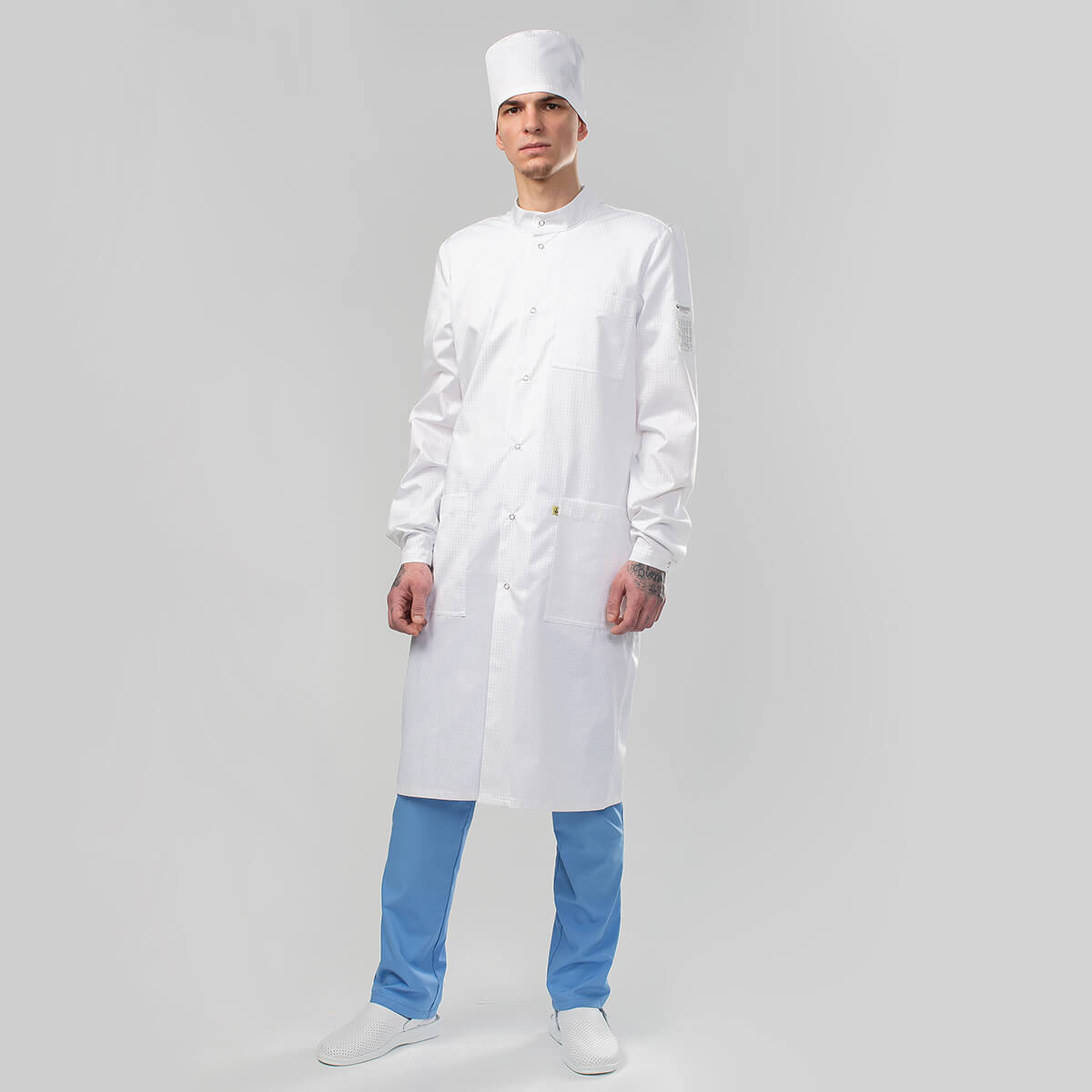 Халат прямого силуэта с центральной бортовой застёжкой на кнопки. Перед халата цельнокроёный с двумя нижними накладными карманами и одним нагрудным накладным карманом, на котором отстрочено отделение под ручку. В левый нижний карман вшит знак EPA. Спинка с кокеткой из-под которой заложены складки. По линии талии расположен хлястик с застёжкой на кнопки. Рукава длинные, втачные, одношовные с цельнокроёными манжетами на кнопках (два положения фиксации). На внешней стороне левого рукава настрочена нашивка с надписью «Одежда технологическая для персонала чистых помещений», с таблицей циклов обработки и датой выпуска изделия. На нашивке имеется свободное место для нанесения потребителем знаков идентификации персонала. Воротник — стойка с застёжкой на кнопку. С изнаночной стороны под воротником — стойкой имеется вешалка.